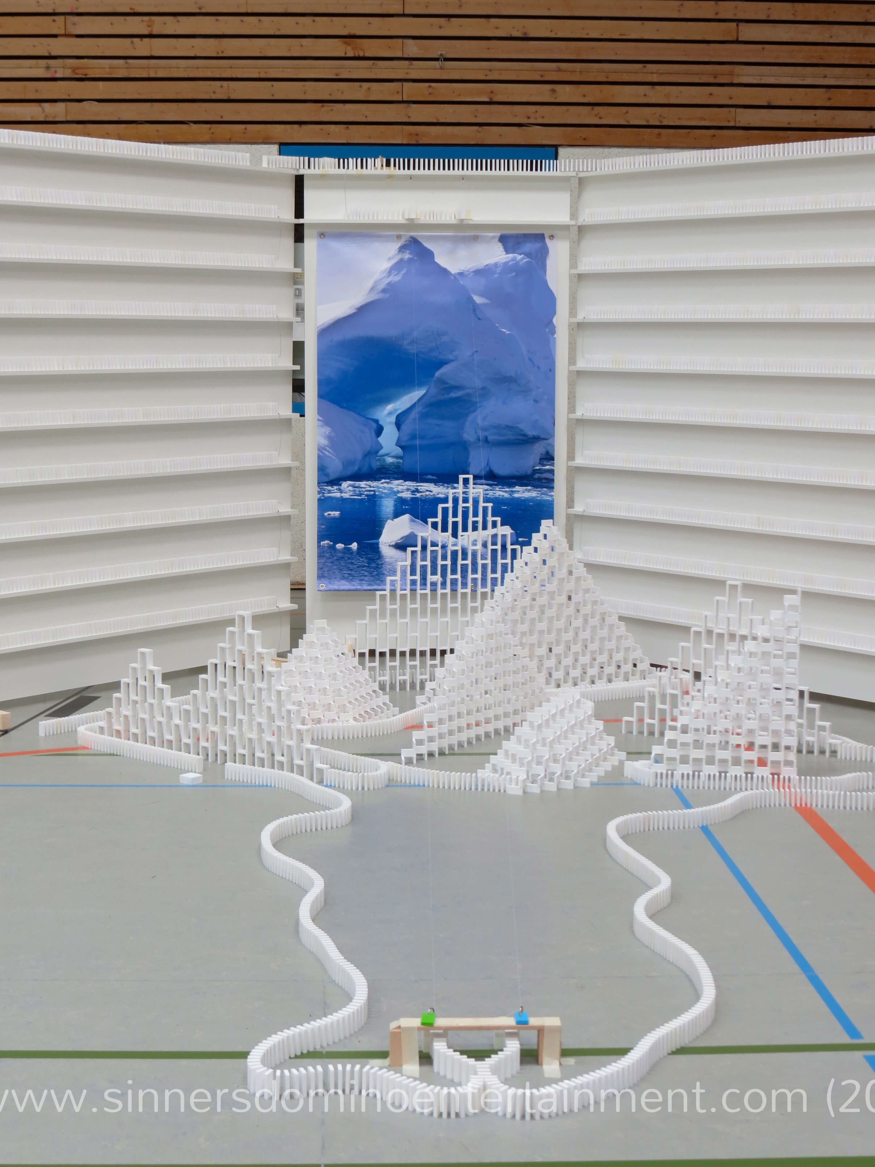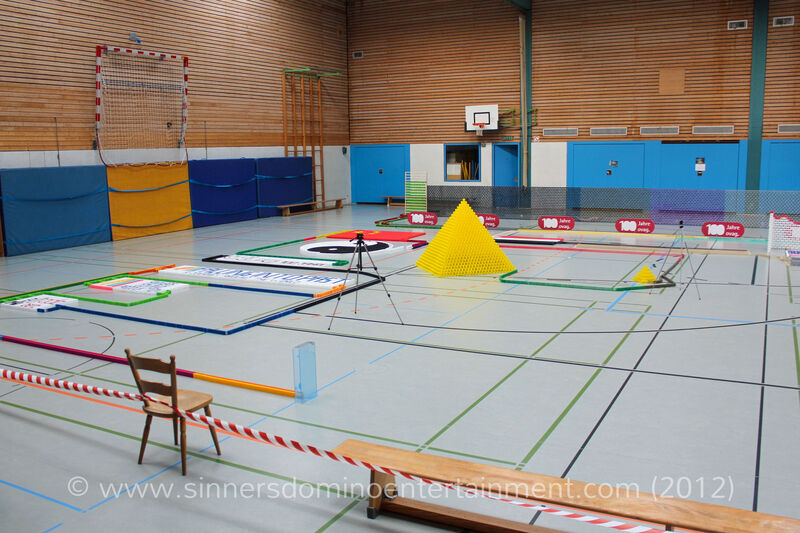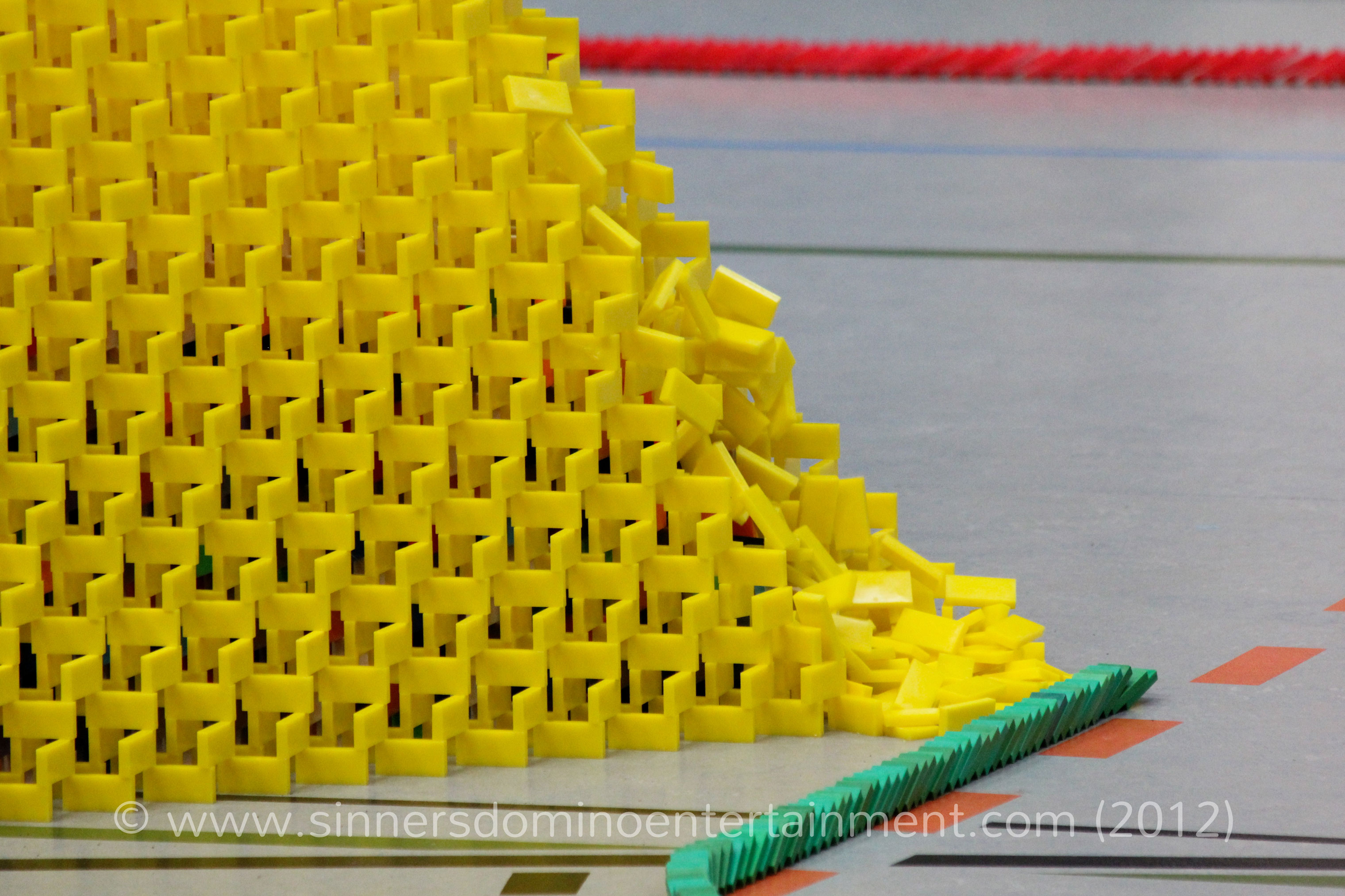 Nach dem Anstoß durch Anne Naumann, Repräsentantin des Partners OVAG, wurde schnell klar, dass die Rekorde beide gebrochen werden könnten. Doch eine Sekunde lang stoppte das laute Prasseln der exakt 31.405 Dominosteine in der 30 Meter langen Mauer, um dann doch einen Moment später wieder einzusetzen. Auch die „Größte 3D-Pyramide“ fiel vollständig um. Darüber freute sich das Rekordteam besonders, da sich die Pyramide während dem Aufbau als besondere Herausforderung entpuppt hatte. Nur 48 Stunden vor der Veranstaltung hätte ein kleiner Aufbaufehler das ganze Unternehmen fast unmöglich gemacht. Julian Kaufmann, einer der Aufbauer aus dem zehnköpfigem Team von Sinners Domino Entertainment, hatte bis zum Einlass der Besucher die letzten Steine auf die Pyramide gesetzt und damit besondere Nervenstärke bewiesen.